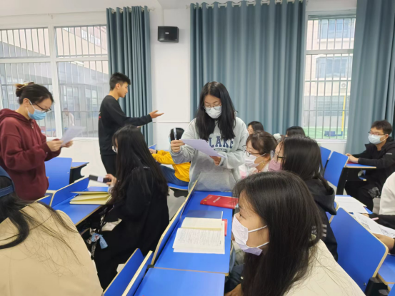 会上,第一个环节为驿站传书,通过这个心理小游戏缓解紧张的氛围,为“沉浸式”主题班会破冰,现场气氛立即热了起来。随后,通过灯光变化和文字朗读营造氛围,让大家沉浸其中,引起学员们的共鸣。然后,通过PPT展示疫情防控期间青年人勇于担当作为的事迹。同学们结合前边的名著感悟和案例分享,畅所欲言,谈论自己的初心和使命。