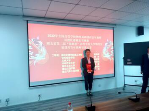 (电信系 宁珍珍)为进一步鼓励青年教师积极投身大学物理实验教学,提升教学水平、推动教学改革、交流教学经验,湖北省第二届“锐族杯”高等学校大学物理实验课程青年教师讲课比赛5月21日在武汉落幕,我校电子科学与信息工程系的陈艳荣老师获得该赛事二等奖。