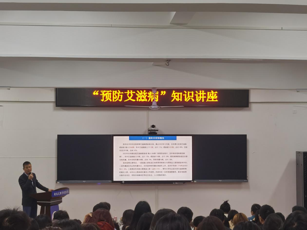 (学工处 梅秋思)为增强大学生对艾滋病的防范意识,遏制艾滋病的传播,11月9日我校学生工作处·团委·武装部联合襄阳市疾控中心、尹集卫生院在一号教学楼105、207等5间教室同时开展“预防艾滋病”知识讲座。其中,襄阳市疾控中心艾滋病防治科贺军科长为1教105教室的百余名师生进行了宣讲,学工处处长、团委书记章莉,各系辅导员代表、班主任代表参加宣讲会。