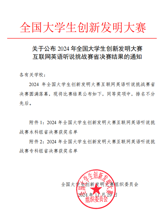 (教育学院 罗娜)11月29日, 2024年大学生创新创业大赛互联网英语听说挑战赛省决赛圆满落幕。经过校赛、省赛两轮竞赛,我校教育学院罗娜老师指导的22级英语专业田明心、23级应用专业秦磊磊经过激烈竞争脱颖而出,分别获得湖北省本科组决赛三等奖和湖北省专科组决赛三等奖。