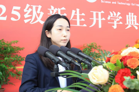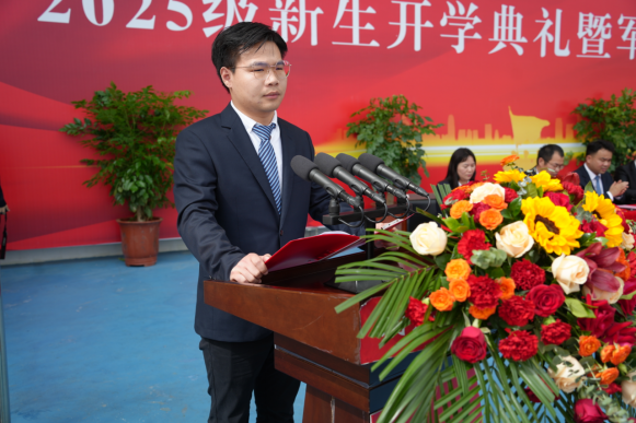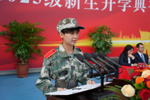 来自教育学院的余相作为新生代表发言。她表示,每一位新生都应珍藏好在军训中收获的勇气与坚毅,满载着对未来的期待与梦想,在理工学院这片热土上脚踏实地,仰望星空,努力书写无愧于时代、无愧于母校、无愧于自己的青春华章!
