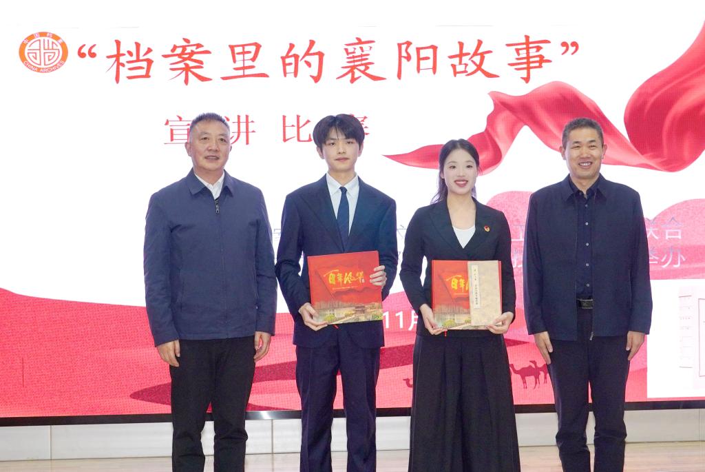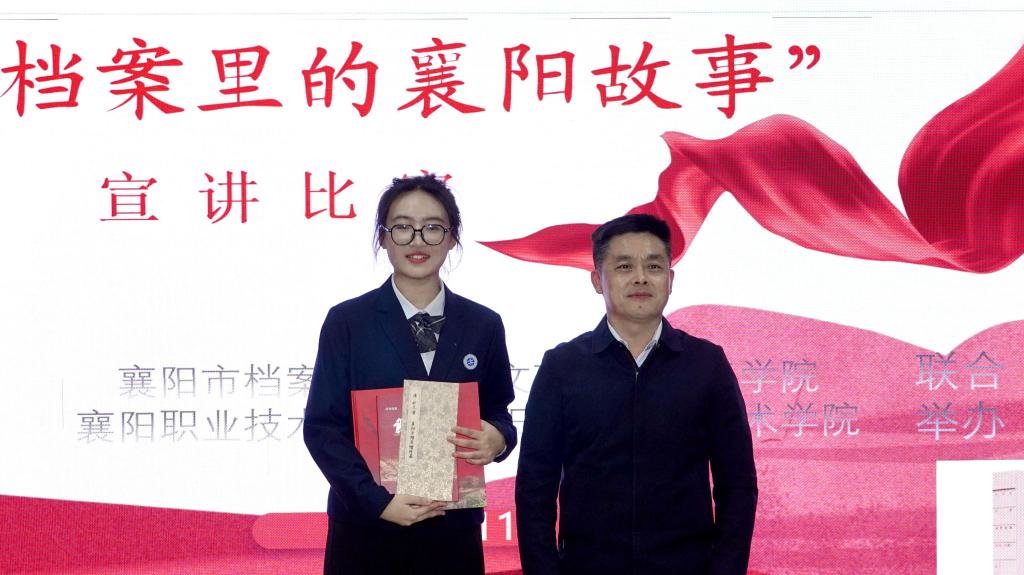 最终,张瑞琪和丁胜坤两位同学凭借扎实的专业素养、生动的表达能力和深刻的情感共鸣,在众多参赛选手中脱颖而出,分别取得第一名和第二名的好成绩。襄阳市档案馆为其赠送了馆藏珍品——清代襄阳籍刘祚宝的举人卷(仿真复制件)、襄阳市档案馆编纂的《百年风华》画册以及书籍《红色档案·襄樊战役实录》。