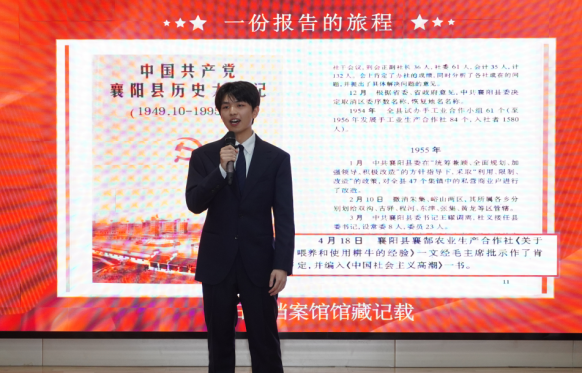 自比赛启动以来,学校高度重视,将其作为培育学生文化素养、提升实践能力的重要契机。赛前筹备阶段,党群工作部、校团委和马克思主义学院精心组织、高效统筹协调,为备战比赛提供全方位支持。指导老师谢婉雯通过深入研读襄阳地方档案文献,从历史事件、名人轶事、民俗风情等多个维度挖掘素材,为参赛学生反复精心打磨稿件并指导演讲技巧。