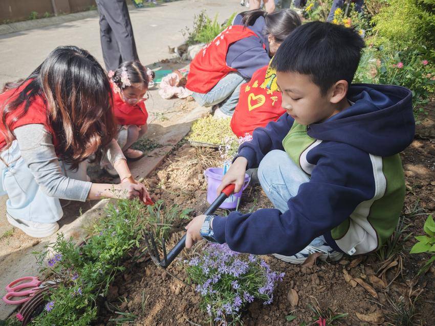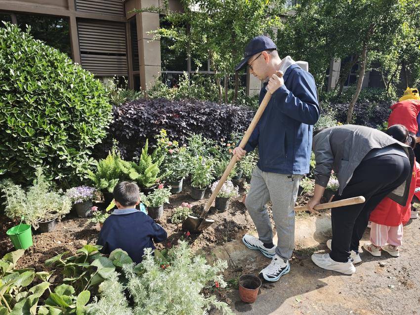 活动当天,在花艺师的指导下,志愿者、居民分工协作化身“花园建造大师”,齐心协力清理闲置地块的杂草、碎石、翻松土壤、划分种植区域,精心栽种花草摆放园艺装饰。儿童在家长和志愿者的带领下亲手种下小树苗、花卉,在实践中感受劳动的快乐,树立爱护环境、参与公益的意识。
