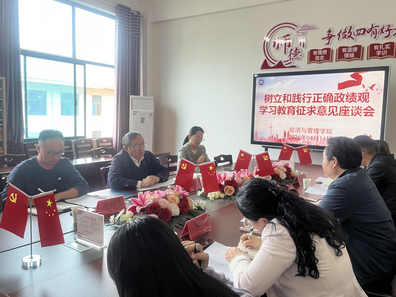 (经管学院 周晓桥)为树立和践行正确政绩观学习教育,倾听教职工心声,4月14日上午,党委书记王守忠、党群工作部部长刘晓君、发展规划部部长王寅龙一行深入经济与管理学院组织调研,与学院教职工代表齐聚一堂,开展树立和践行正确政绩观学习教育征求意见座谈会。