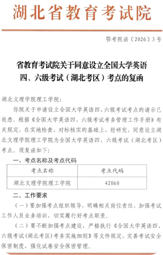 (教学科研部 潘晓虎)近日,湖北省教育考试院正式批复,批准我校设立全国大学英语四、六级考试(CET)考点,考点代码:42060,这是继2025年我校获批全国计算机等考、软考、教资考点以来,获批的第四个国家级考试考点。这标志着我校办学条件、教学管理水平和考试组织水平迈上新台阶。