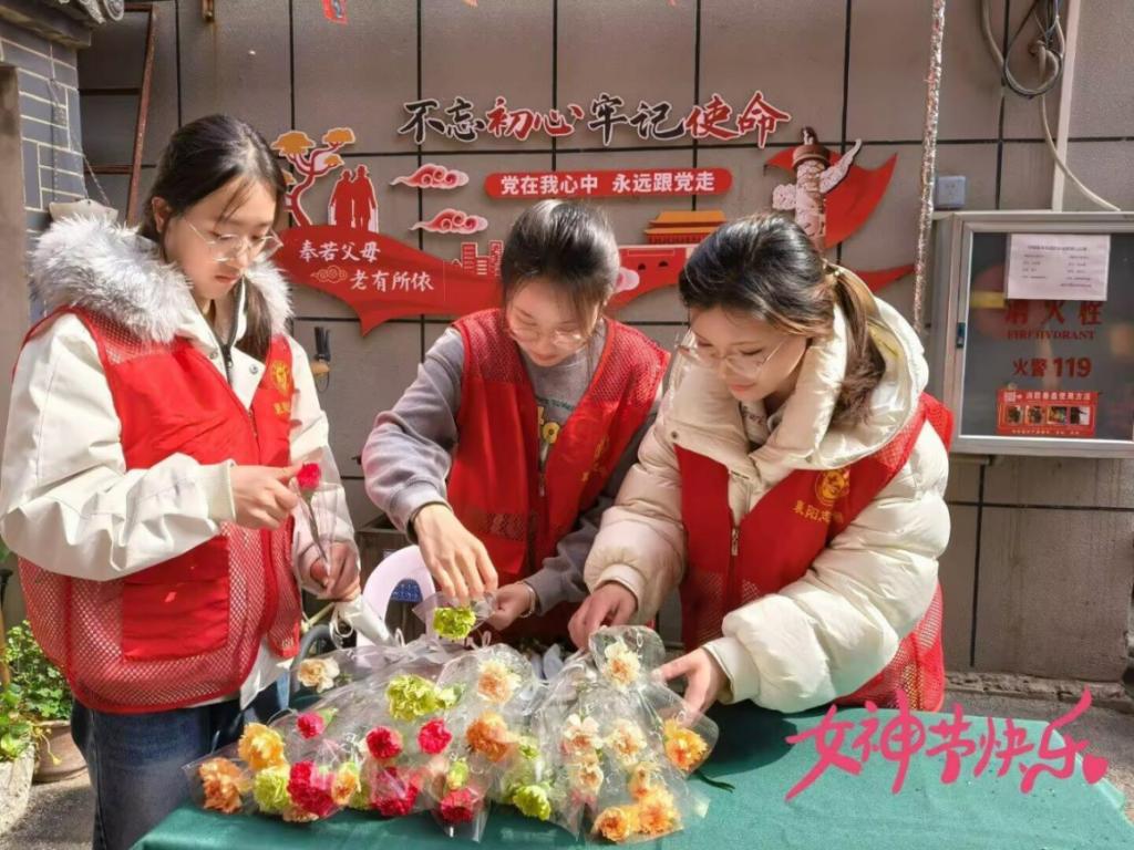午后时分,敬老院的活动室里静悄悄的,志愿者们轻手轻脚地忙碌着。几位女生围在长桌前,手里忙着包扎花束、修剪花枝、搭配色彩、系上蝴蝶结,每一个步骤都格外用心。“奶奶们收到花一定会开心。”一位志愿者边说边调整着丝带的角度。而在另一侧,男生们正轻声细语地陪在刚睡醒的老人身边聊天。