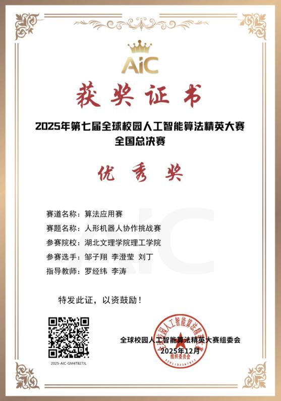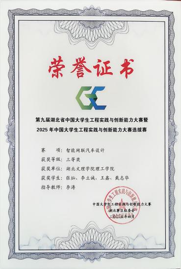 近年来,我校学生在相关领域竞赛中屡获佳绩,充分体现了扎实的专业基础与创新能力:2025年第七届全球校园人工智能算法精英大赛荣获省级二等奖(湖北赛区)及全国总决赛优秀奖(人形机器人协作挑战赛);全国三维数字化几何形状设计大赛荣获湖北赛区一等奖;湖北省第十五届“挑战杯”大学生课外学术科技作品竞赛荣获三等奖;第九届湖北省中国大学生工程实践与创新能力大赛荣获湖北省三等奖。