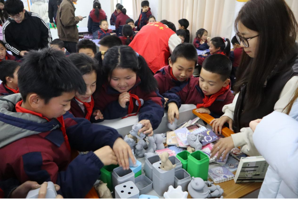 活动现场,志愿者们以雷锋经典事迹开篇,用生动故事传递志愿精神,并带领孩子们学唱雷锋歌曲,在歌声中感悟雷锋精神的时代内涵。在趣味互动环节,孩子们分组参与主题拼图游戏,在协作中学会沟通、包容与专注,体会团队力量。活动设置限时挑战与激励机制,表现优异的小组获得学院精心准备的3D打印文创小物件,让科技成果与志愿温度相互交融。