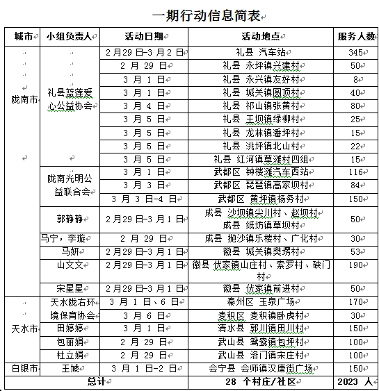 2 月 29 日,“护雁计划”一期行动落地实施,他们在陇南、天水、白银等 3 个返城务工者较集中的城市的 9 个县区 28 个村庄、社区开展活动,为返城务工者开展防疫知识普及,同时派发酒精、香皂、消毒湿巾等基础防疫物资。