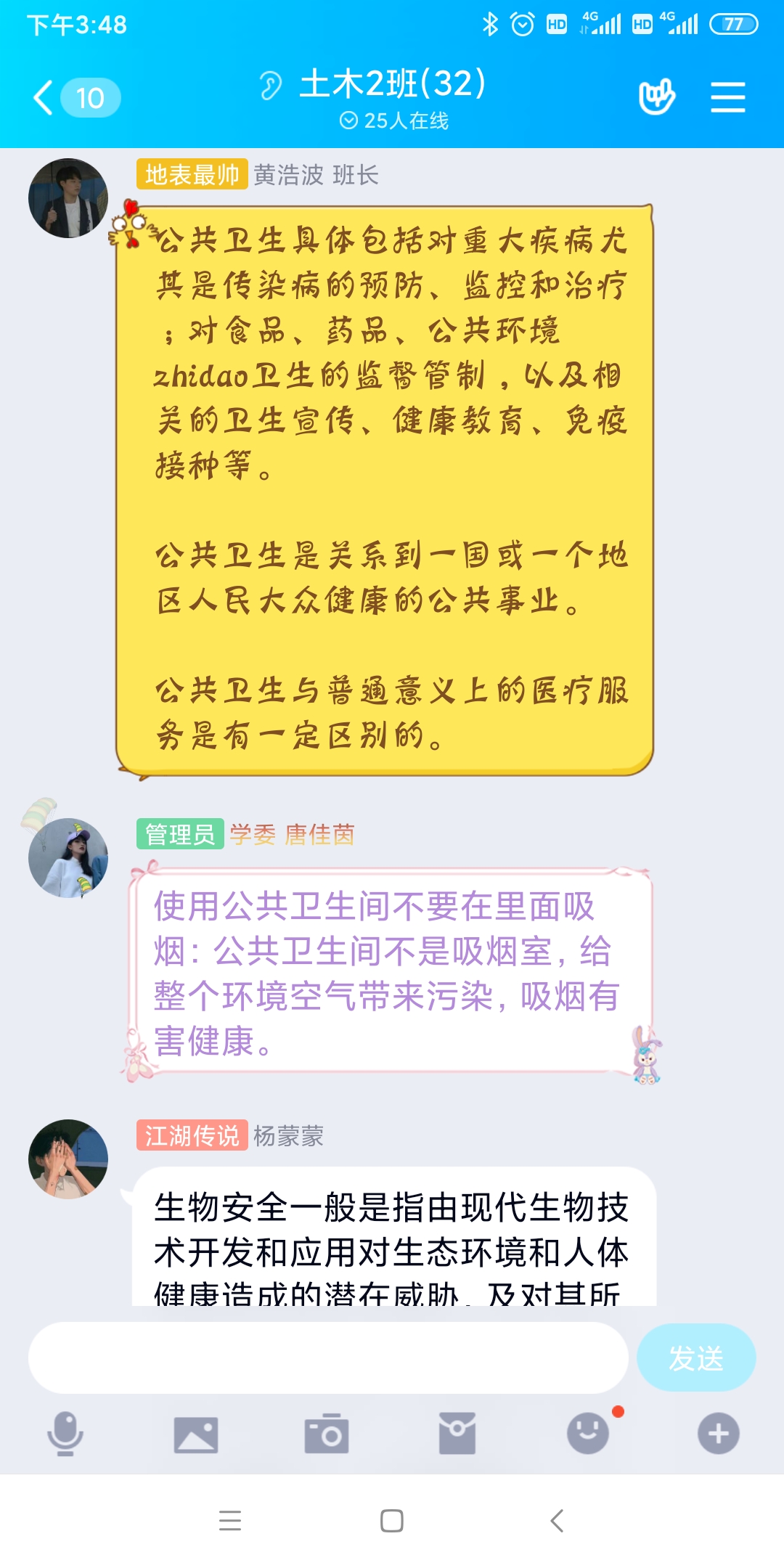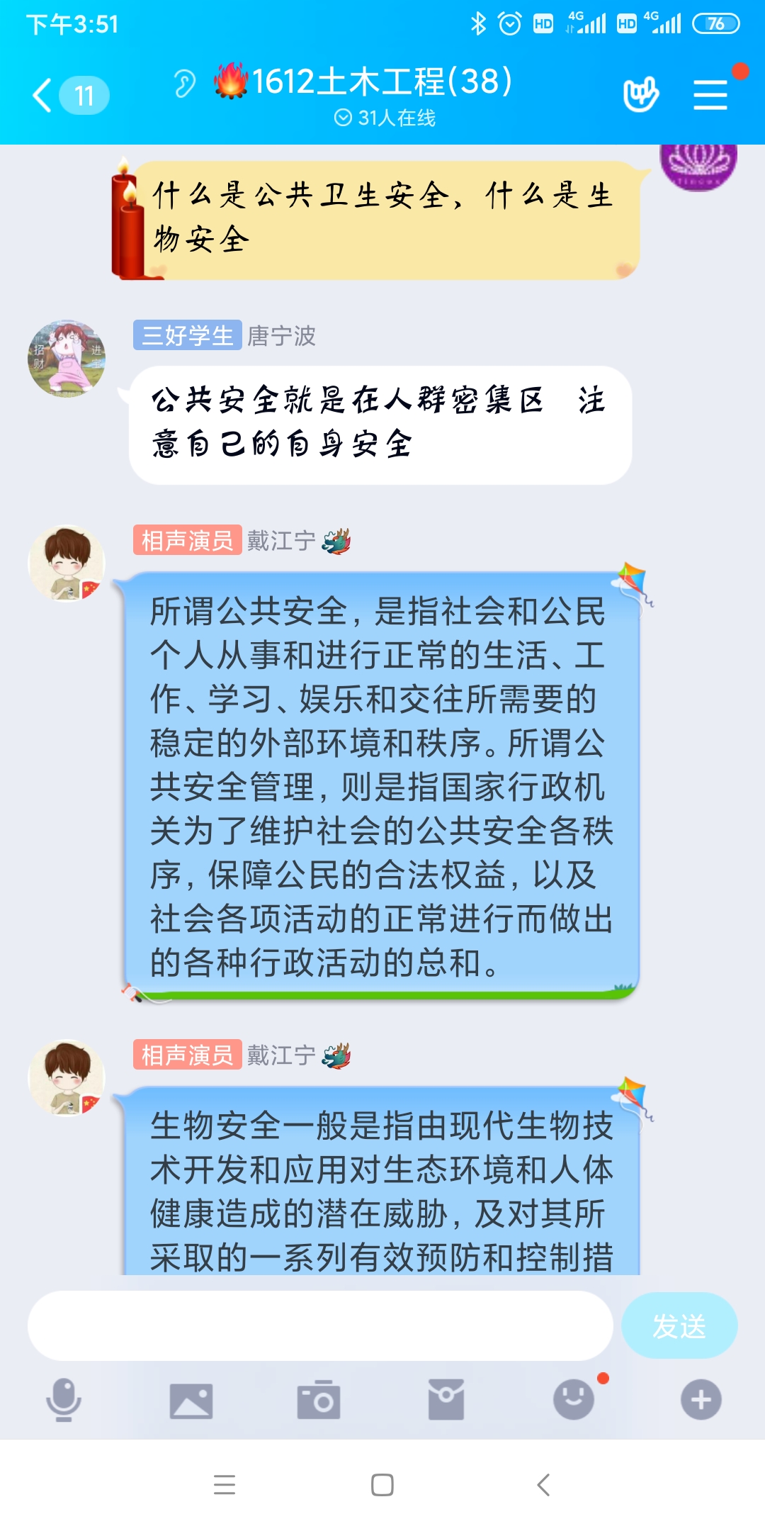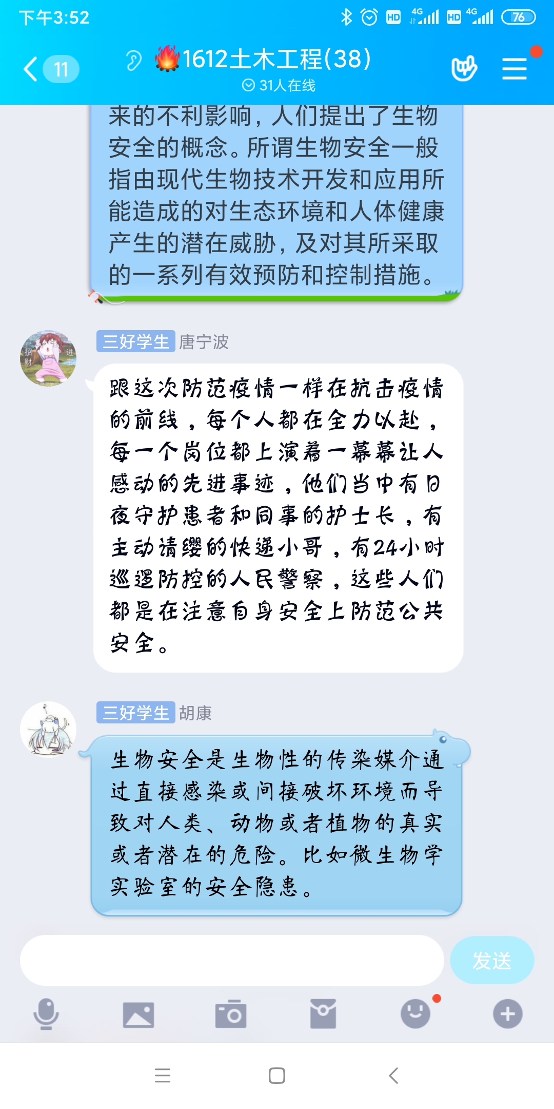 二是组织开展主题班会。4月15日,我系组织各个团支部召开主题班会,共同学习公共卫生安全、生物安全等知识,并结合学生实际情况,围绕对公共卫生安全和生物安全的认识、如何维护公共卫生安全和生物安全等话题展开了讨论交流。并通过分享在抗疫一线用实际行动维护公共卫生安全、捍卫国家安全的先进典型及感人事迹,来激发广大学生应对突发公共事件的职责义务意识,提升维护国家安全的自觉性和主动性。