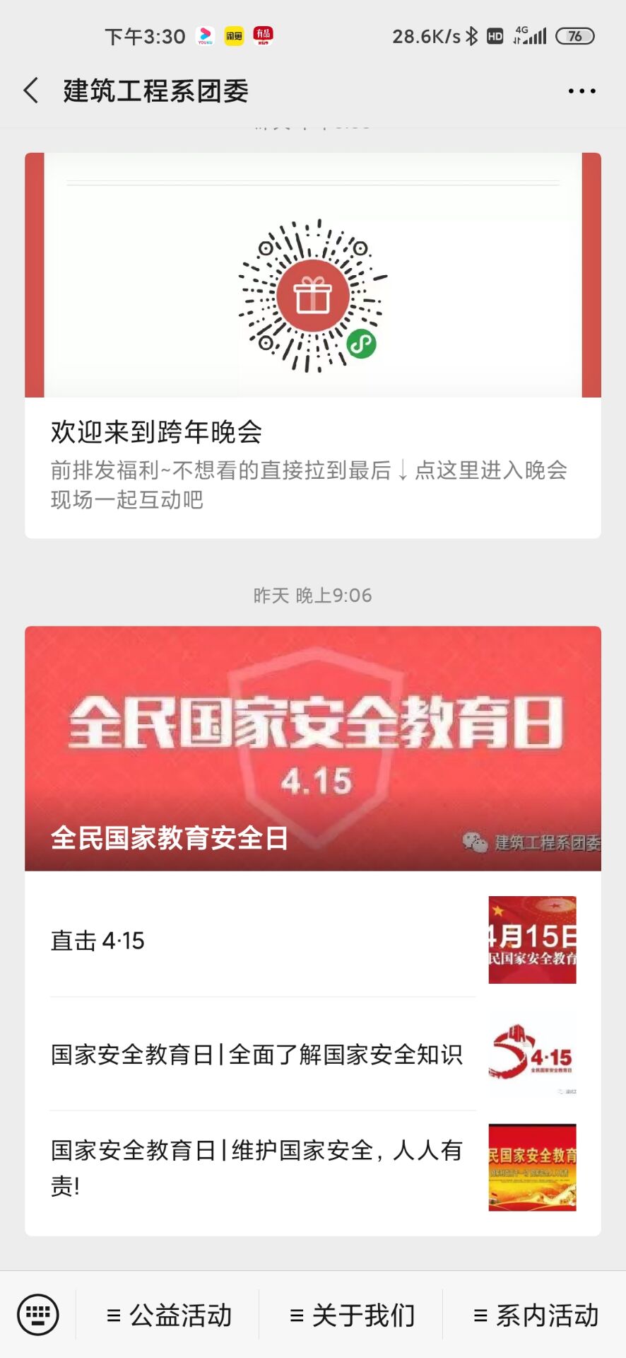 三是通过新媒体加大了对国家安全日的知识普及。系部通过微博、微信公众号等,推送全民国家安全教育日的相关内容,引导学生学习浏览,让学生更加全面的了解国家安全知识,同时也让学生明白维护国家安全人人有责。