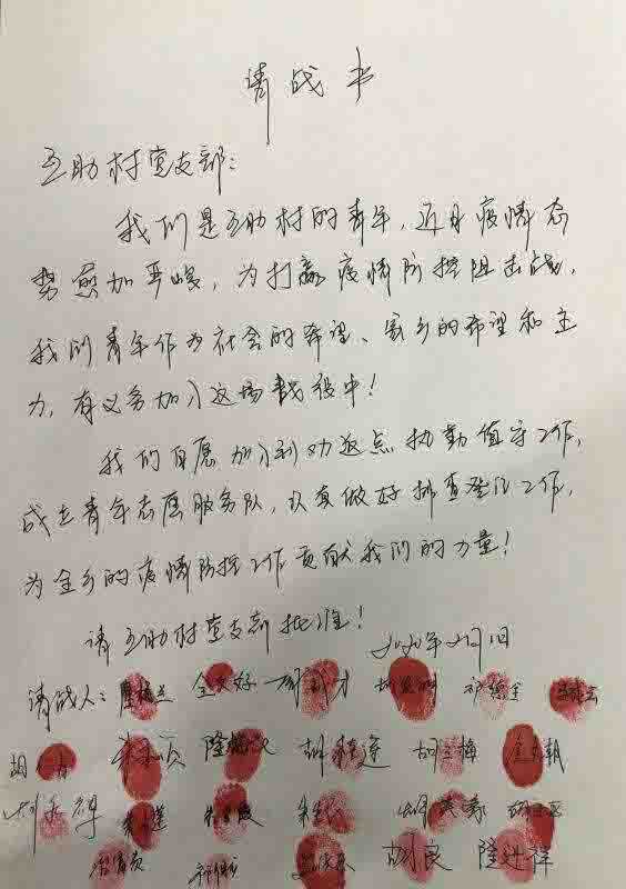 疫情爆发以后,全村上下都在为打赢防疫工作忙碌着,冶富贵和一个同学看到村子里当前的形势,有了自发组织村里大学生积极参加防疫志愿服务工作的想法,并得到了全村23名年龄相仿的大学生赞同。一开始,村里出于安全考虑,并没有同意这么多人这样干。在大家的一再请求下,并向乡村提交了按有23名同学指纹的防疫值班“请战书”后,才得到上面的批准,终于第一支属于大学生自发组织防疫值班的“青年先锋队”诞生了。