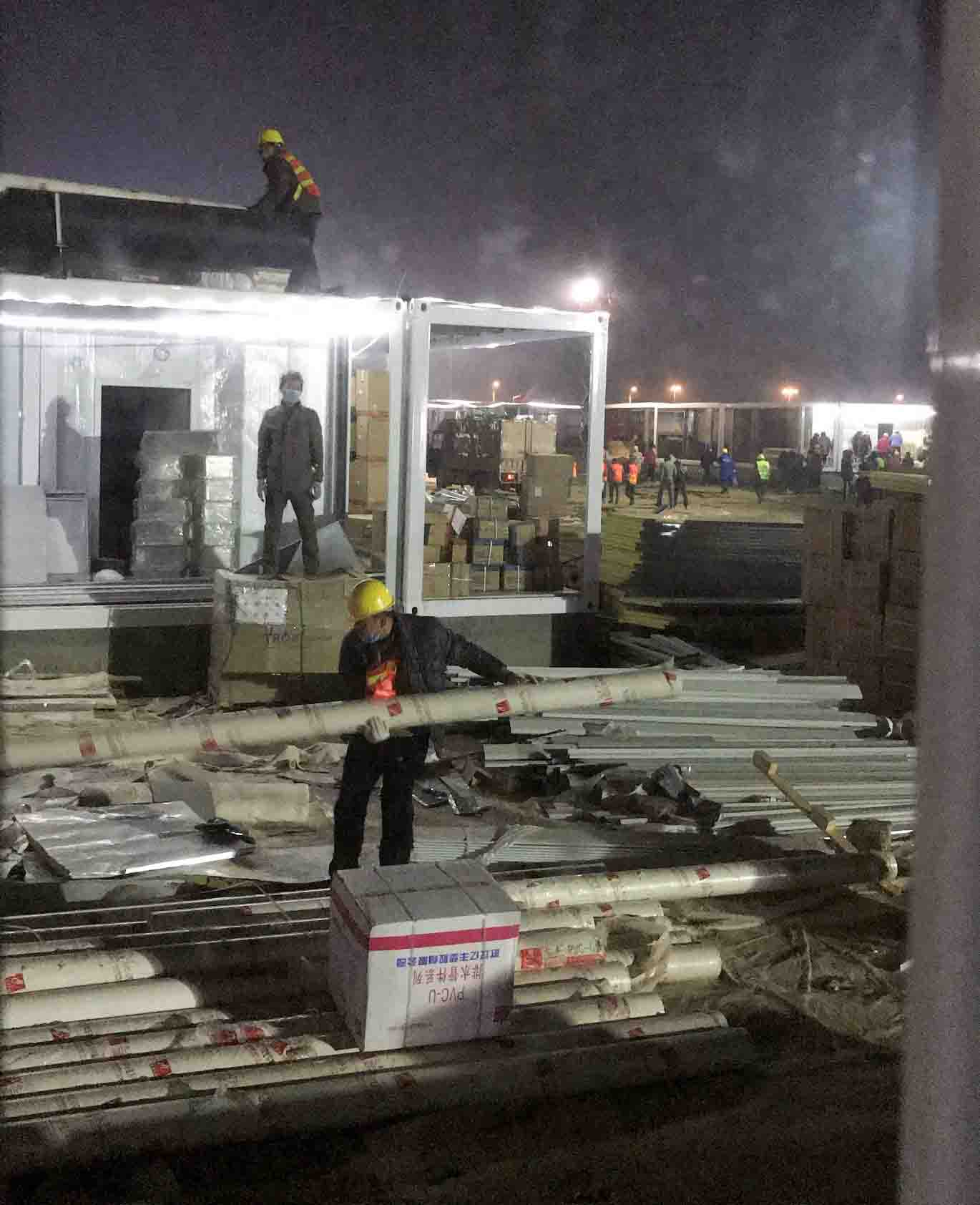 大家知道,建设雷神山医院时间紧,任务重,来到工地第一个班就是晚班,从下午五点半到凌晨三点半,主要工作是组装室内的隔墙与门窗洞口,这个工作不是很难,但是由于工期紧,一个工作面里多个工种班组同时施工,所以工具少,供电紧张,而且由于工地比较大,人手不够,所以建设材料都是堆在外边的路边的,需要自己先去找材料搬到室内在进行组装,整个工作做起来非常的不轻松,但大家干起活来都很积极,我也凭借自己的专业知识,帮着工友们看图纸和找材料。