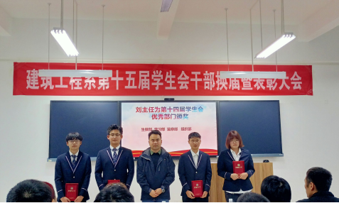 接下来,付书记宣读了《建筑工程系关于表彰第十四届学生会优秀部门、优秀干部、优秀干事的决定》,并由张主任、付书记、刘主任分别为“优秀干事”、“优秀干部”“优秀部门”颁发了荣誉证书。第十四届学生会优秀干事代表何杨思源、优秀干部代表詹奕葶和优秀部门代表金伟分别发言,分享自己过去一年工作过程的感受。