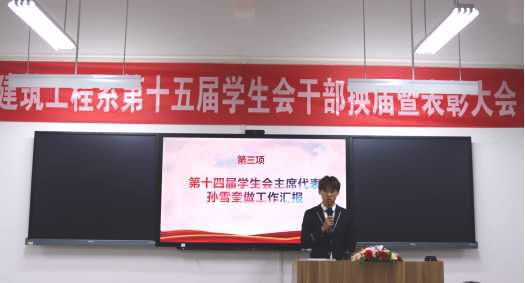 而后,第十四届学生会主席代表孙雪奎做工作汇报,对过去一年的工作进行总结,并以视频的形式展现了第十四届学生会的工作风采。