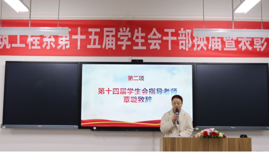 首先,系第十四届学生会指导老师覃老师致辞,充分肯定了上一届学生会的工作,并向新一届学生会成员提出殷切的希望。