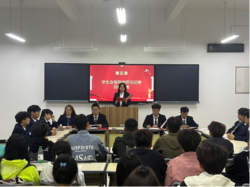 首先,主持人介绍了此次会议的议程;然后主席团成员之一何杨思源简单介绍了学生会基本情况及相关规章制度,主席团成员之一杨安嘉简单介绍了学生会各部门的干部,以加深新加入学生会干事对于各部门及干部的认识;接着主席团成员之一张迪文进行了9月工作总结及10月工作安排;最后学生会指导老师汪老师再次对新成员的加入表示了祝贺并对未来学生会的发展提出了希望和要求,学生会成员之间要感情融洽,精诚团结,共同进步,要以广博的胸怀和开放的心态,团结各年级学生,调动大家的积极性,发挥大家的聪明才智,为广大同学成长成才服务。