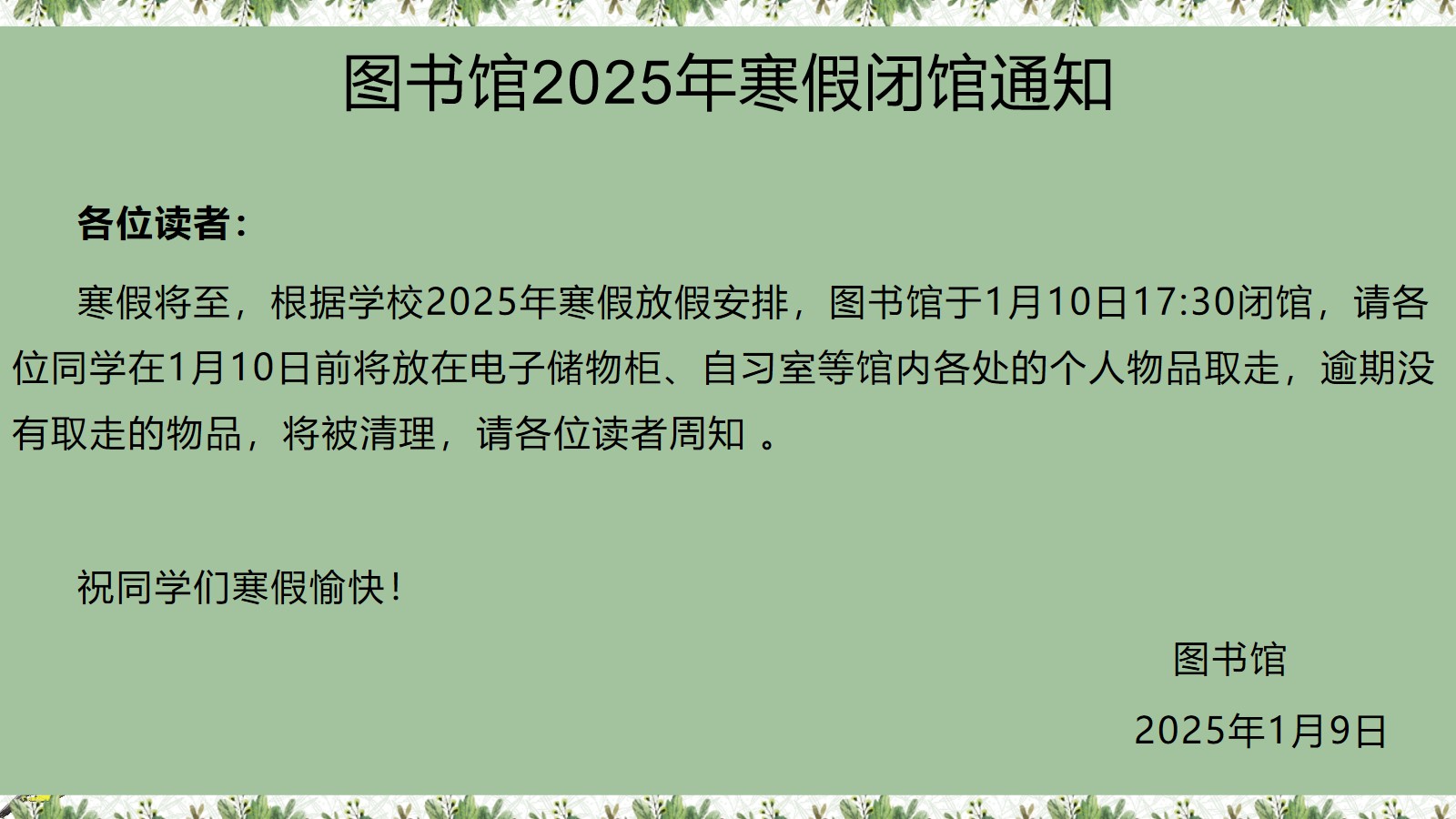 图书馆2025年寒假闭馆通知