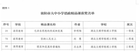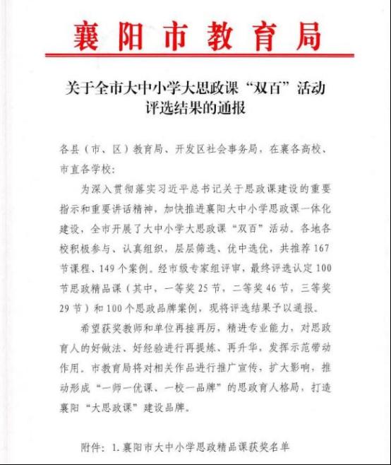 (马克思主义学院 李明翔)近日,襄阳市大中小学大思政课“双百”活动评选结果揭晓。我校马克思主义学院获评1个思政品牌案例奖、3个思政精品课奖,充分彰显了学校在思政教育教学与品牌建设方面的扎实成效和鲜明特色。