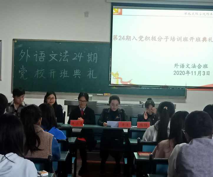 (外语系 王凯)11月3日中午,外语系和文法系党校第24期入党积极分子培训班开班典礼在4教205教室举行。文法系党总支副书记黄洁、外语系党总支副书记骆小青、文法系学生党支部书记陈倩、外语系辅导员王凯及全体学员参加。典礼由党校班主任张高芬老师主持。