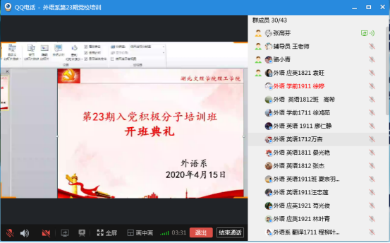 (外语系 王凯)4月15日晚,外语系第23期党校入党积极分子培训班开班典礼在网络上通过QQ电话举行,外语系党总支副书记骆小青、外语系学生党支部书记张高芬及全体入党积极分子参加。典礼由党校班主任张高芬主持。