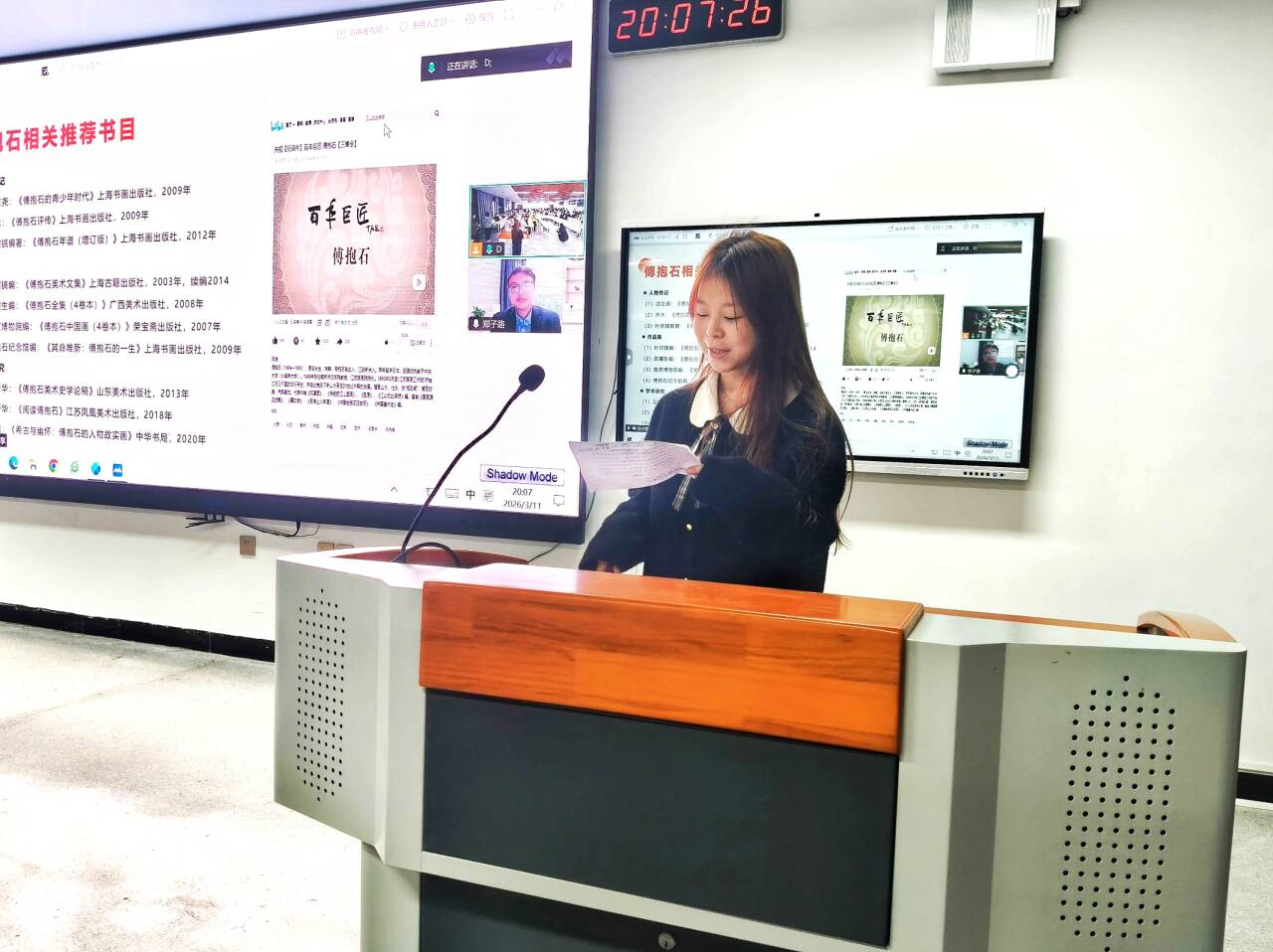 围绕“傅抱石艺术美学思想研究”主题,郑老师系统梳理了傅抱石艺术创作与理论研究的核心脉络,从“石相”等关键概念切入,剖析了傅抱石艺术思想中蕴含的东方美学精神与家国情怀。他还向同学们推荐了《傅抱石的青少年时代》《傅抱石美术文集》等权威著作,为大家搭建起系统研究傅抱石的学术桥梁。