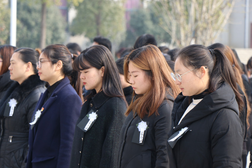 凛冽的寒风中,全体师生身着黑色服装,胸前佩戴白花,在图书馆前面对鲜艳的五星红旗,列队肃立。
