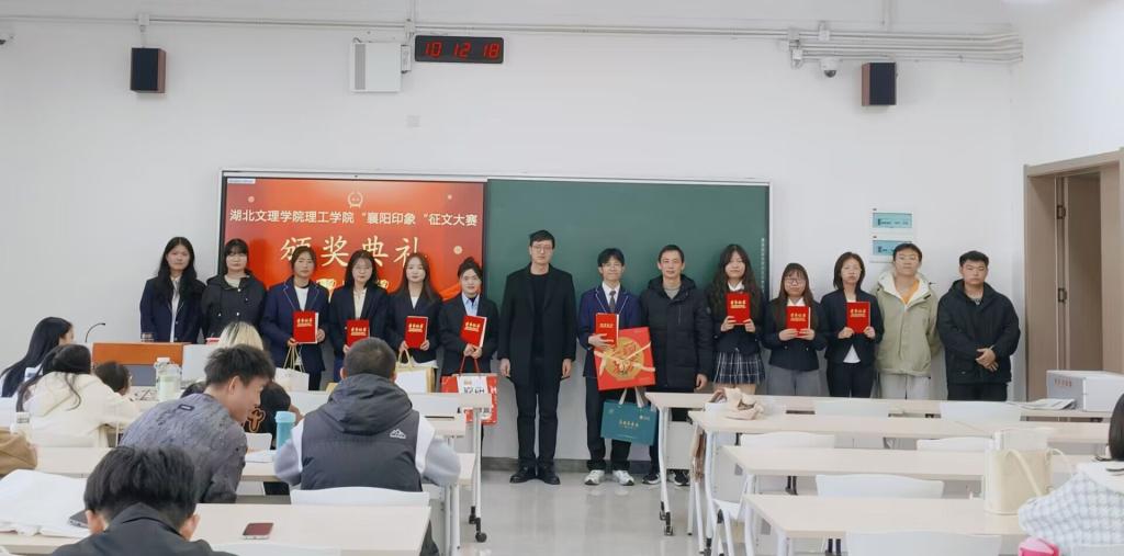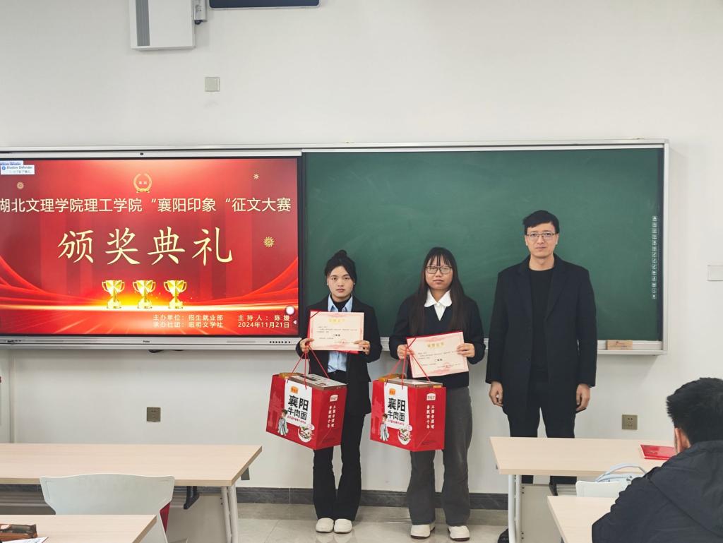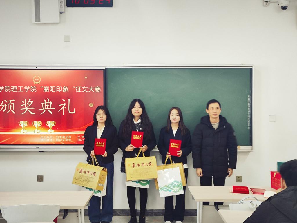 (教育学院 乔曦涵 龚程)11月21日上午,由招生就业部主办、昭明文学社承办的2024年“襄阳印象”征文大赛在东津校区12-408教室举行颁奖典礼,至此,为期两个月的“襄阳印象”征文大赛圆满落下帷幕。