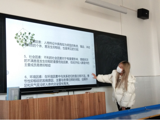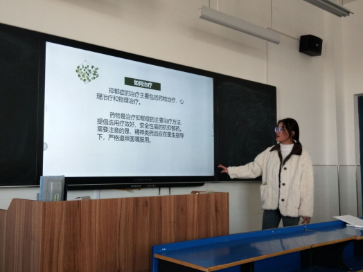 本次由四个小组的学生进行抑郁症知识的展示,从资料的查找和选取、PPT的制作到PPT的讲解展示都是小组成员集体分工和合作的结果。同学们主要为大家展示了患抑郁症的原因、抑郁症的种类、具体表现,以及疏导自己、远离抑郁的方式方法等。在展示的过程中,大部分同学都能大方地将小组成果展示出来,也有少数同学显得比较害羞,还需要多多锻炼,提升胆量。