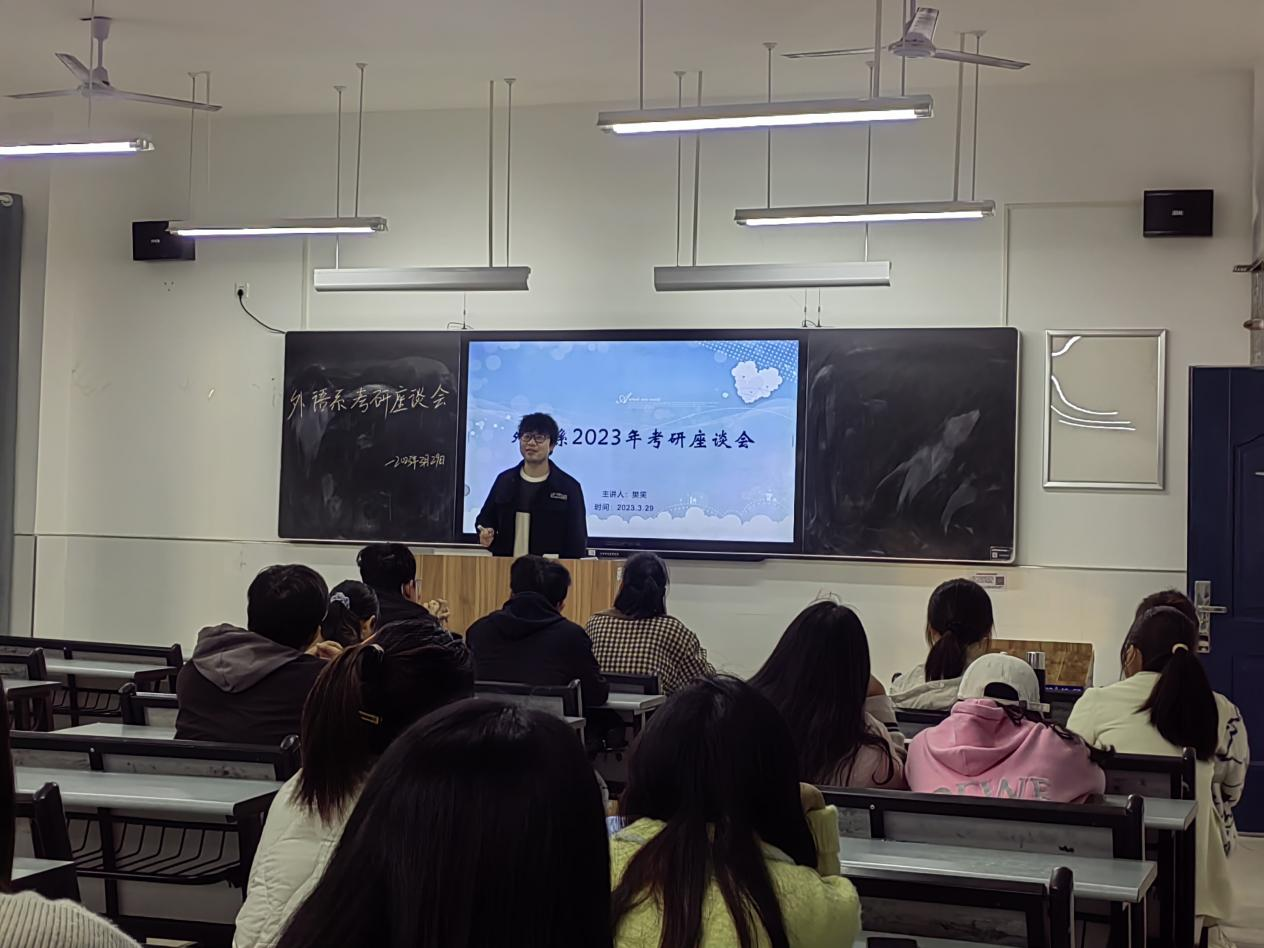 (外语系张高芬)为进一步加强同学们对研究生入学考试的认识,提高考研热情,明确考研目标,掌握相关考研技巧,3月29日下午六点,外语系在8教212开展了考研交流指导座谈会。本次讲座邀请樊笑老师主讲,各年级有考研意向的同学参加讲座。