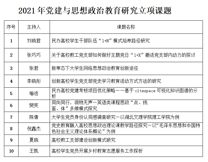 根据《关于党建与思想政治教育研究课题申报工作的通知》要求,各基层党组织积极组织党务工作者、辅导员、思政课教师参与课题申报。经专家组评审,学校研究决定对10项党建与思想政治教育研究课题予以立项,每项课题给予2000元的经费资助,经费在研究项目结题时报销。