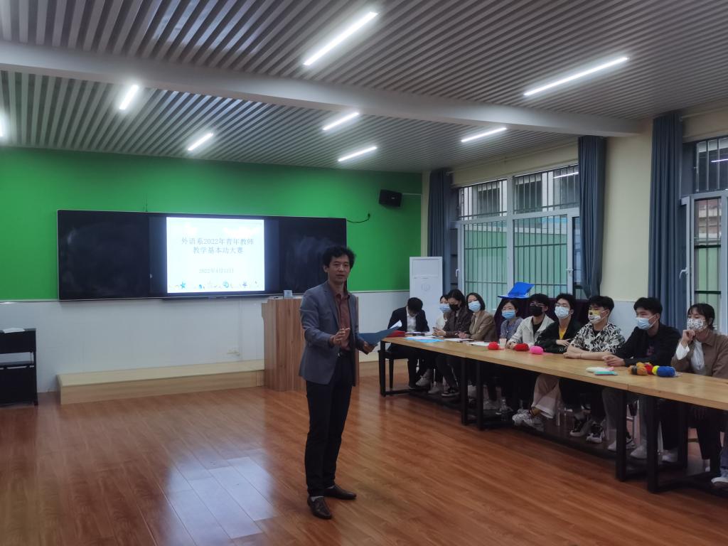 (外语系 樊笑)为推进新时代教师队伍建设,提升高校青年教师教书育人能力,促进高质量教育体系建设,4月12日,外语系在8教114教室举办以“展技能、亮风采、强内功、促发展”为主题的青年教师基本功大赛。本次比赛特邀湖北文理学院理工学院常务副院长耿帮才教授、校级特聘教授李训奎教授、校级特聘督导白葵教授担任此次大赛的评委。