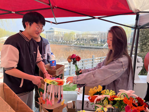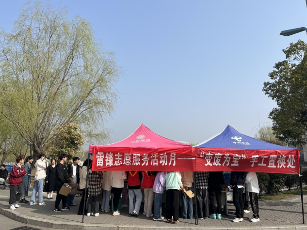 活动开始后,同学们参与热情极高,不少同学在了解置换规则后纷纷就近在校园内寻找可回收物及其他废品。除了大学生,本次活动还吸引了不少小朋友前来参与。不一会儿现场的手工品便被“一扫而空”。