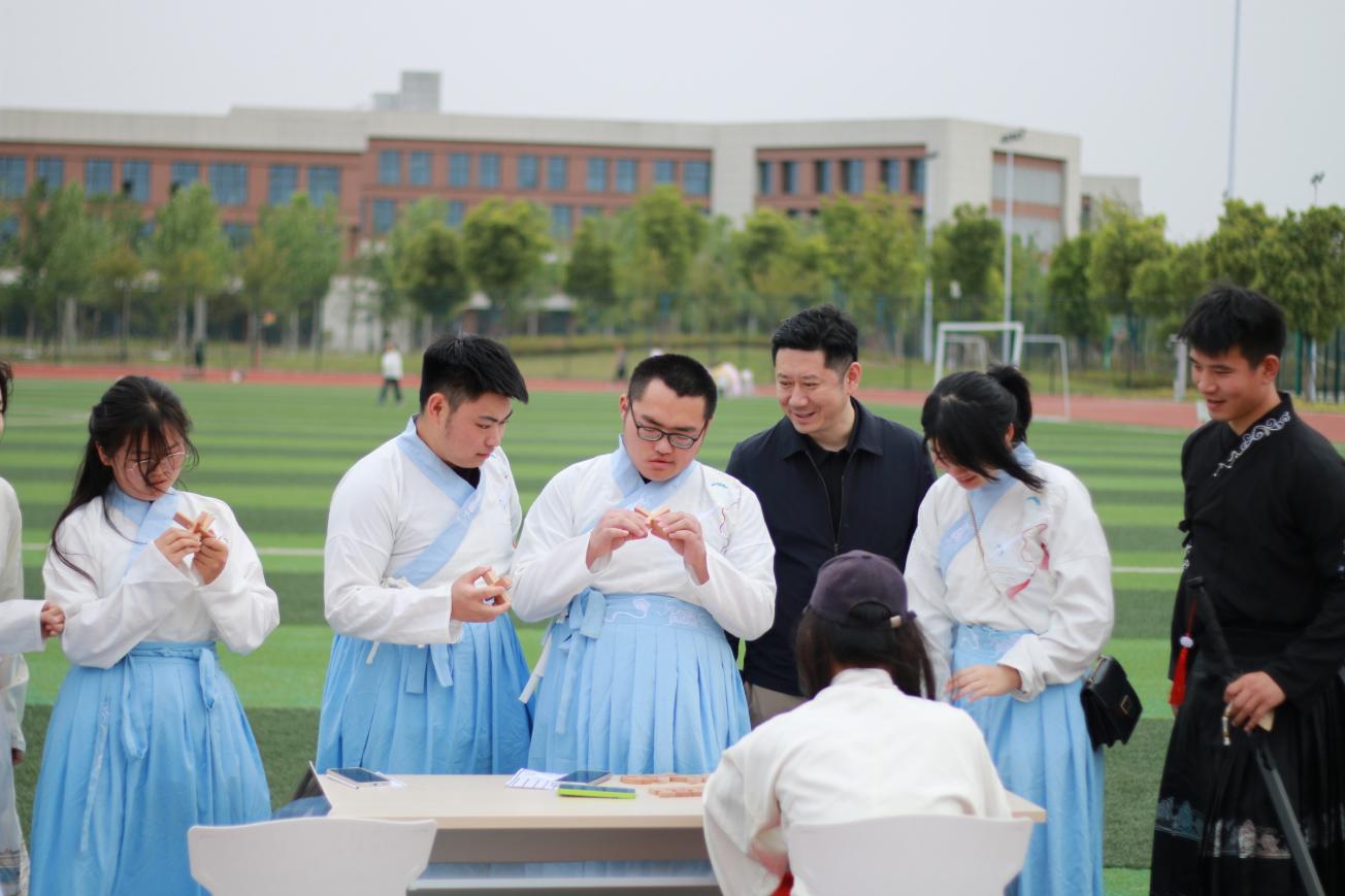 启幕仪式上,蓝雨话剧社社长唐春灵详实阐述了活动规程,随后副校长耿帮才宣告活动开幕。活动现场设置投壶、漆扇制作、古法蹴鞠等18个互动项目。投壶区喝彩声不断,参与者调整姿势体验古人竞技之趣;漆扇台前,同学们调制漆料创作扇面;绿茵场上,旌旗招展,各展英姿,进行蹴鞠之赛;“此乃鲁班锁,古之巧器也”,锦衣少年拈起鲁班锁,六根木条如蛰伏灵兽,榫卯暗藏机锋。