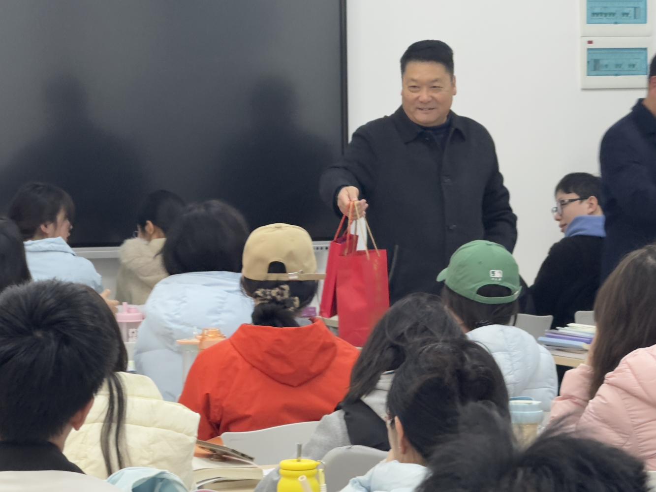 杨海浪充分肯定同学们备战考研的辛勤付出,勉励大家坚定信心、勇攀高峰;叶永涛强调坚持与努力必有回报,鼓励大家敢于追梦,未来可期;赵乔寄语学子以梦为马、不负韶华,保持积极心态迎接挑战。随后,在温馨氛围中,校领导们为每一位同学发放了精美礼包,包括定制文具和暖心零食,传递学校的深切关怀与真挚鼓励。