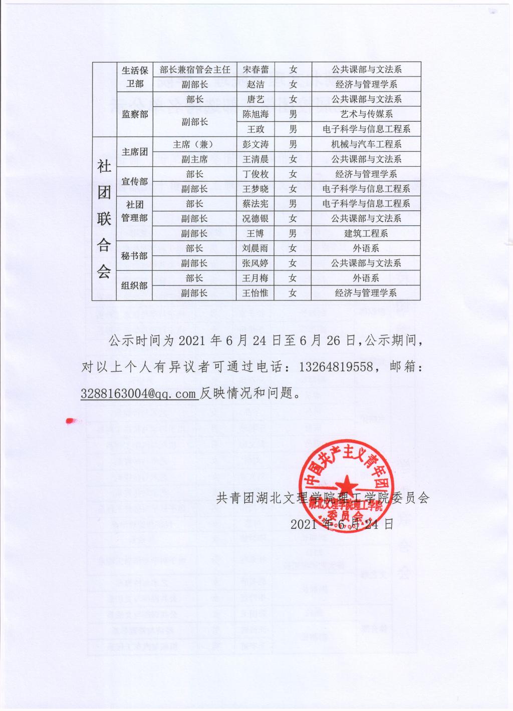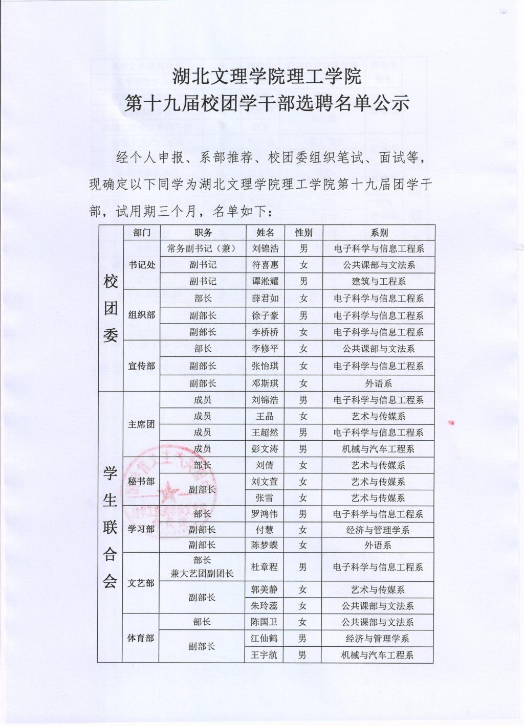 湖北文理学院理工学院第十九届校团学干部选聘名单公示