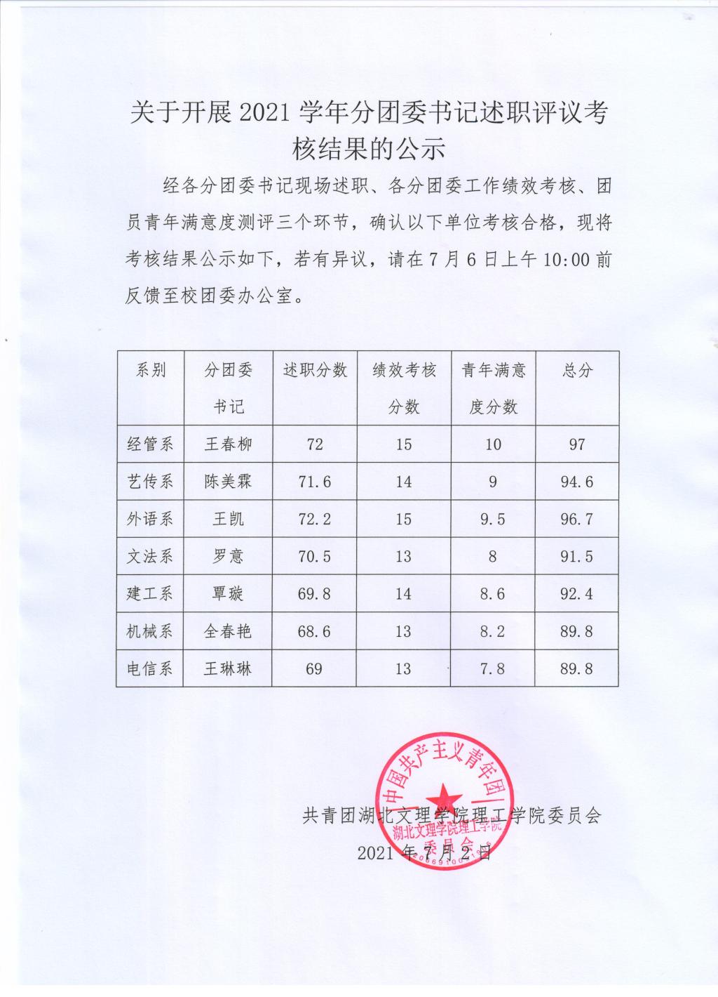 关于开展2021学年分团委书记述职评议考核结果的公示