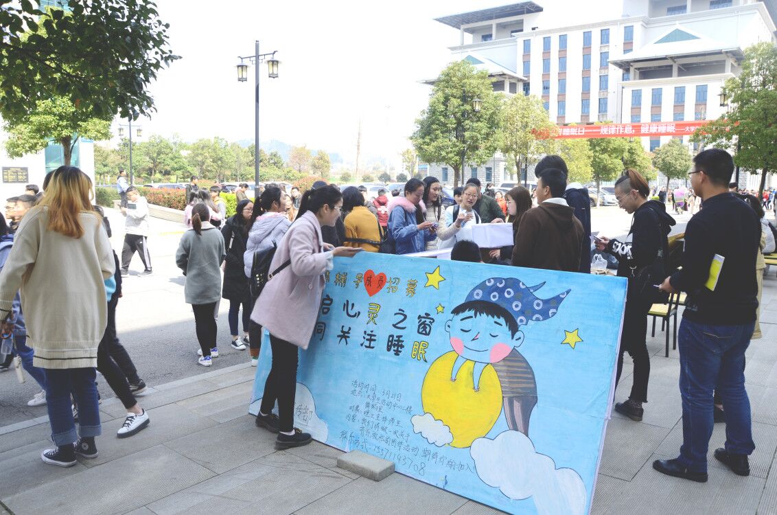 2018年3月21日,国际睡眠日,湖北文理学院理工学院大学生心理健康中心为了响应“良好作息,健康睡眠”的主题,号召大学生关注睡眠问题。组织了室外和室内的活动。在一教的展台,我们设置了“扫一扫”,“抽号码”等各种形式的抽奖活动并为同学们设置了丰厚的礼品。我们还将玩乐与音乐相结合在展台处放置了各种乐器,让同学们体验音乐带给我们的愉悦。同学们都玩的不亦乐乎。