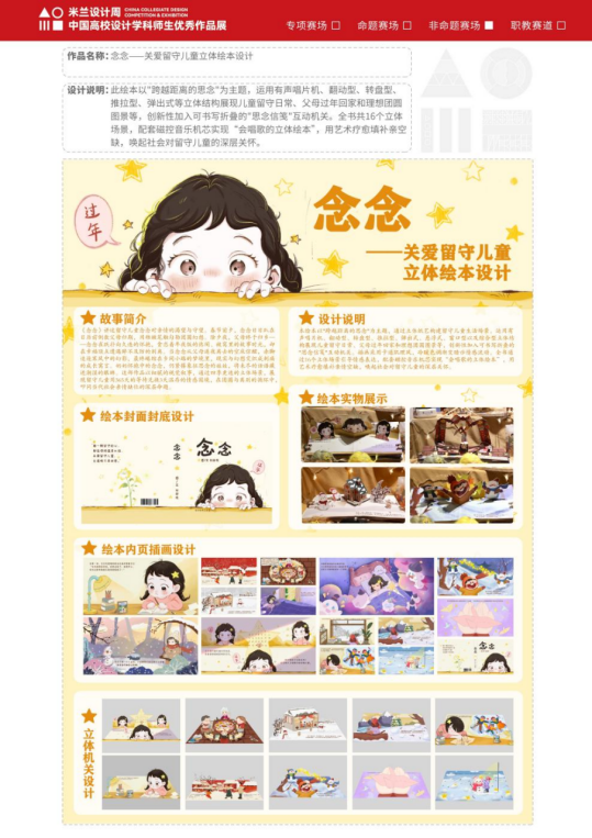 在被誉为设计界“奥斯卡”之一的“米兰设计周——中国高校设计学科师生优秀作品展”中,学院学子表现尤为亮眼。作品《念念——关爱留守儿童立体绘本设计》(学生:刘邱悦、牛莲平,指导教师:闫雪菲、夏晓)不仅荣获省级一等奖,更一举摘得国家级一等奖桂冠,实现了该赛事奖项级别的重大跨越。此外,《守望者》(周紫逸,指导教师:周瑞)、《海月绮梦——基于情感体验视角下沿海民宿设计》(阮哲瑛、朱钰铃等,指导教师:万婧、陈美霖)等多件作品分获国家级、省级一、二、三等奖,获奖总数达28项,充分彰显了学院在设计创作领域的深厚底蕴与强劲实力。