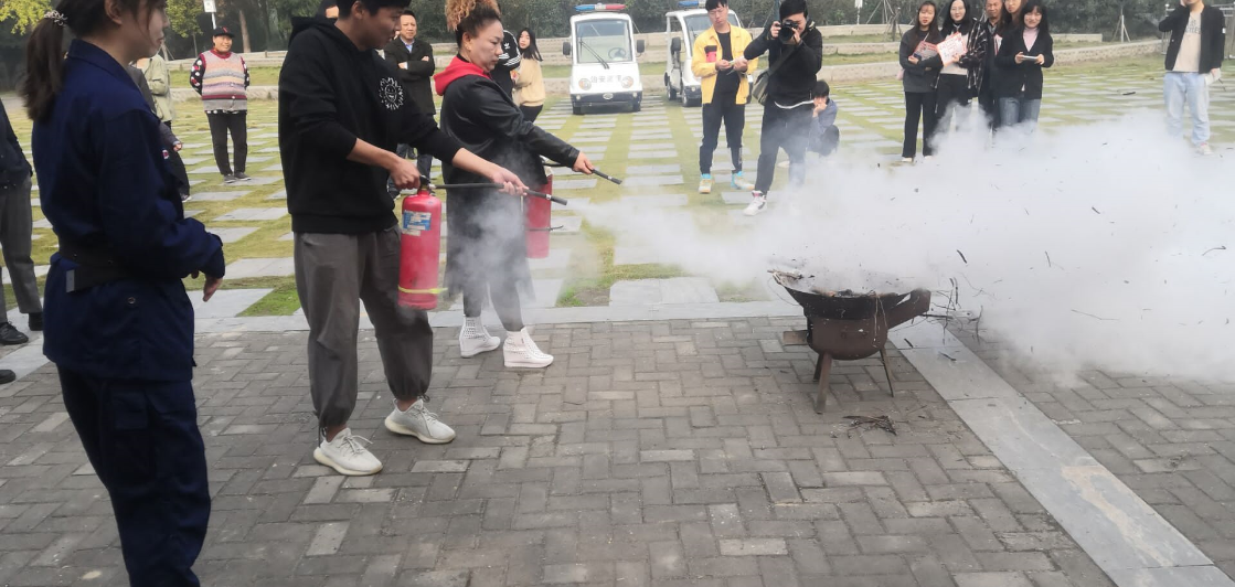 2, 在进行完消防安全知识讲解后,我们开始与群众参与学习灭火器的使用,由群众代表以及我系入党积极分子代表组合,进行灭火器的实操演练。
