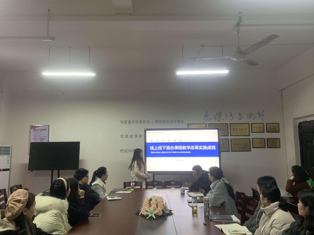 闫雪菲老师分享了《版式与字体》线上线下混合式课程建设。她从线上与线下的课程设置、考核方式、教学特色环节以及实施效果进行交流,将其上课过程中遇到的问题和解决的方案分享给各位老师,并对下一步课程改革提出设想,为其他课程的建设提供参考依据。