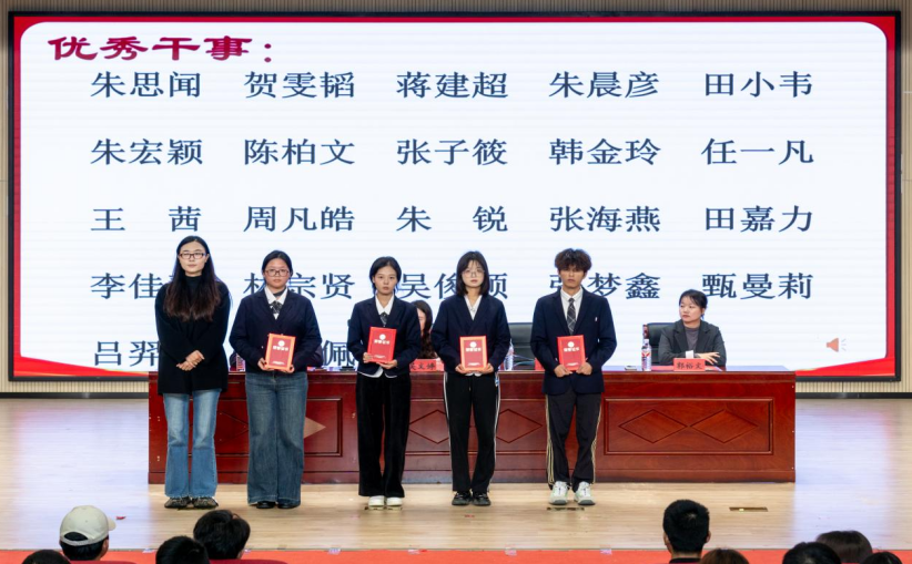 大会在庄严的国歌声中拉开帷幕。主持人介绍到场嘉宾后,第六届学生会代表粟彦翔作工作汇报,全面回顾过去一年的服务成果与工作经验。学生党支部书记高原老师宣读表彰名单后,颁奖环节将大会推向高潮。