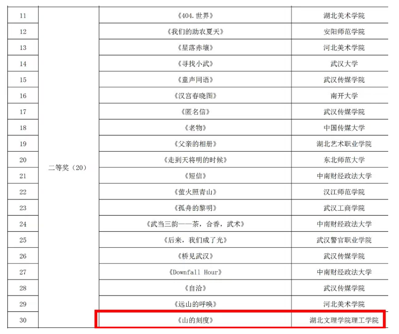 (艺传学院 戴孟廷)近日,湖北省大学生教学实践短视频大赛圆满完成评审工作。大赛聚焦短视频教学内容质量、创作专业性与教育实践价值,从学科教育、影视创作、教育技术三大维度搭建竞技平台。我校艺传学院学生王凯、郭力火等创作,教师戴孟廷指导的作品《山的刻度》凭借鲜明的教育导向、良好的创作技艺与深厚的实践内涵,斩获大赛二等奖,彰显了艺传学院在传媒类专业教学改革与实践育人领域的扎实成效。