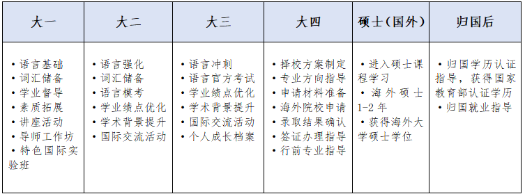 2.配备具有海外留学硕士背景的资深国际导师,开展一对一培养服务,实时记录学生学习情况,及时指导解决学生需求,制定个人专属成长档案。