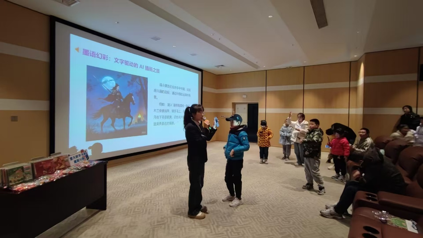 本次活动通过幻灯片和科普视频,生动展示了AI的基本概念、应用领域及未来展望。现场的小读者被AI在智能家居、自动驾驶等日常生活中的广泛应用深深吸引。在AI创意阅读环节,小读者兴奋地选择自己喜欢的书籍段落,通过语音输入AI系统,生成与内容相匹配的精美插画。这一创新的阅读方式不仅增强了小朋友们的阅读体验,还让他们亲身体验到了AI技术的魅力,小朋友们积极分享插画背后的故事,探讨AI如何助力学习和生活,展现他们丰富的想象力和创造力。